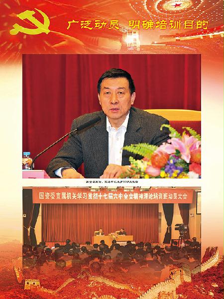 為深入學(xué)習(xí)貫徹黨的十七屆六中全會精神,研討進(jìn)一步落實(shí)“十二五”時期中央企業(yè)改革發(fā)展總體思路和國資監(jiān)管、國企發(fā)展“兩新目標(biāo)”,以及機(jī)關(guān)建設(shè)規(guī)劃綱要的思路和措施,同時梳理2011年的工作,研究2012年的工作,按照委國資委黨委的部署,11月15日至12月9日,國資委先后舉辦了4期學(xué)習(xí)貫徹六中全會精神理論培訓(xùn)班。國資委主任、黨委書記王勇親自為參加培訓(xùn)班的全體同志作動員報告,并在第一期班暨黨委中心組學(xué)習(xí)會上作了總結(jié)講話。在京的國資委黨委委員、副秘書長,機(jī)關(guān)廳局長、監(jiān)事會各辦事處主任和全體黨員干部以及直屬事業(yè)單位、管理局系統(tǒng)黨政領(lǐng)導(dǎo)班子成員、直管協(xié)會和部分京外企業(yè)在京單位黨組織負(fù)責(zé)同志共計1100余人參加了培訓(xùn),監(jiān)事會主席單獨(dú)進(jìn)行了培訓(xùn)。