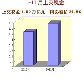 2011年中央企業(yè)認真貫徹落實黨中央、國務院各項決策部署,生產(chǎn)經(jīng)營總體上保持平穩(wěn)較快增長,主要經(jīng)濟指標創(chuàng)歷史新高。1-11月,累計實現(xiàn)營業(yè)收入18.4萬億元,同比增長22.6%;累計實現(xiàn)凈利潤8317.9億元,同比增長3.6%;上交稅金1.52萬億元,同比增長24.8%,增速比營業(yè)收入高2.2個百分點,比凈利潤高21.2個百分點;截至11月底,中央企業(yè)資產(chǎn)總額達到27.8萬億元,同比增長16.5%;凈資產(chǎn)10.5萬億元,同比增長12.8%。