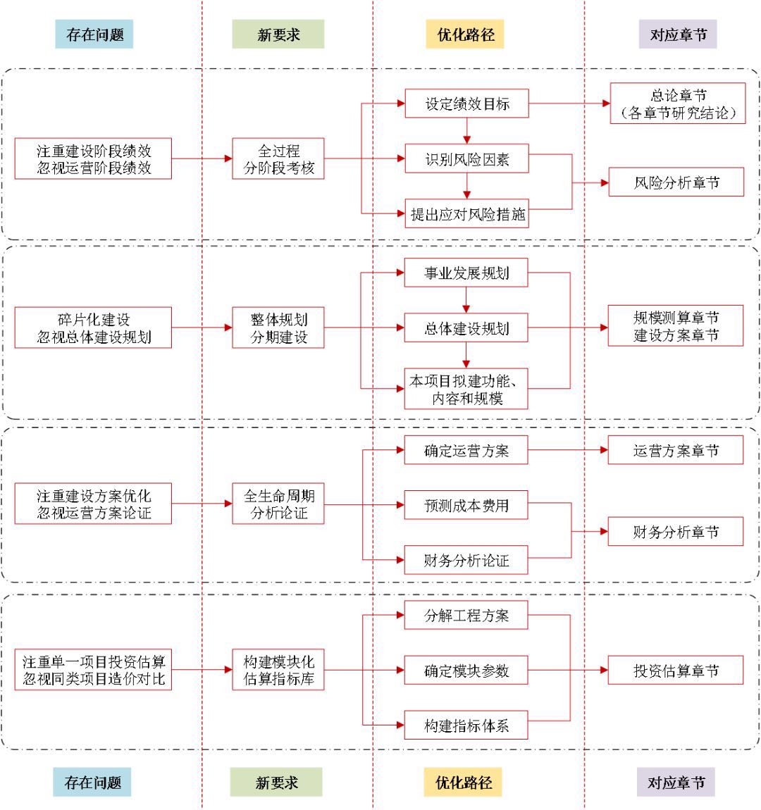 鑒于新時(shí)期高質(zhì)量發(fā)展的新要求,可行性研究除重點(diǎn)分析建設(shè)理由、建設(shè)方案和投資估算等傳統(tǒng)內(nèi)容外,還應(yīng)加強(qiáng)績(jī)效考核指標(biāo)、總體建設(shè)規(guī)劃、全生命周期分析、模塊化估算指標(biāo)體系等內(nèi)容的論證: