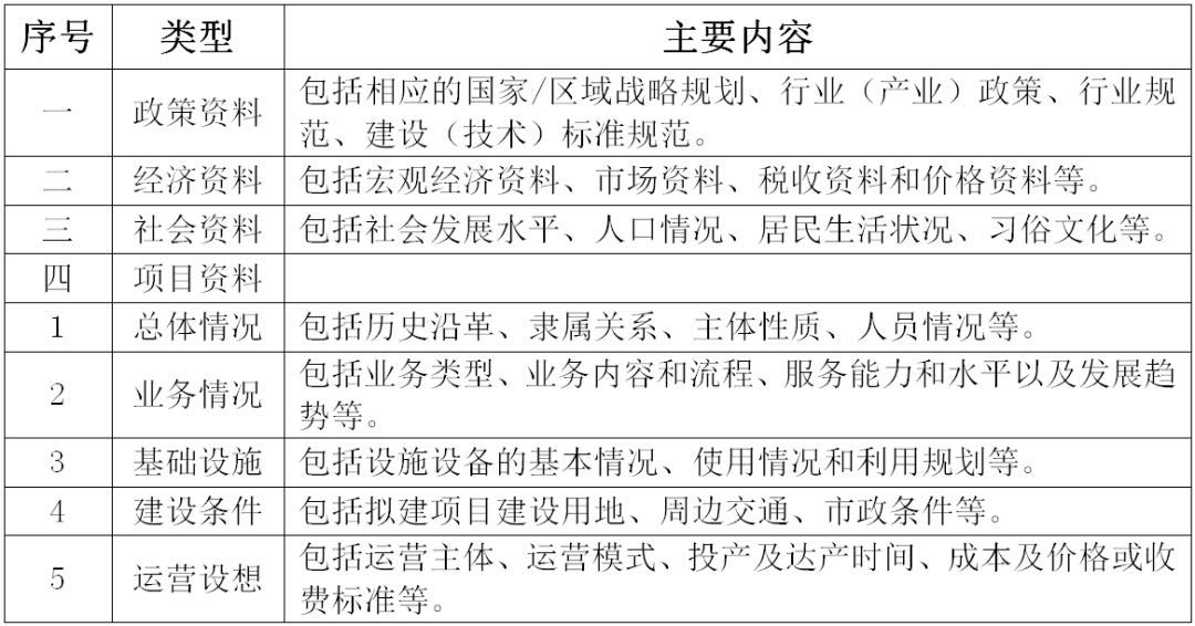 資料的真實(shí)性、準(zhǔn)確性和完整性是編制一份研究充分、依據(jù)可靠、論述嚴(yán)謹(jǐn)、內(nèi)容詳實(shí)的可行性研究報(bào)告的重要基礎(chǔ)。因此,可行性研究工作應(yīng)全面搜集與項(xiàng)目建設(shè)相關(guān)政策法規(guī)、標(biāo)準(zhǔn)規(guī)范、業(yè)務(wù)流程、服務(wù)數(shù)據(jù)、功能需求等基礎(chǔ)資料(如表1),完成從宏觀至微觀,從現(xiàn)狀情況到發(fā)展需求(規(guī)劃設(shè)想)等方面的基礎(chǔ)資料搜集工作,為報(bào)告編制奠定堅(jiān)實(shí)基礎(chǔ)。