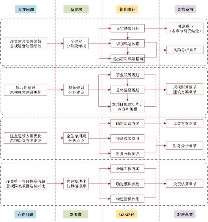 可行性研究報(bào)告是可行性研究成果的主要載體。針對(duì)投資項(xiàng)目可行性研究現(xiàn)存問題的梳理,從全過程分階段考核、整體規(guī)劃分期建設(shè)、全生命周期分析論證、構(gòu)建模塊化估算指標(biāo)庫等要求,對(duì)可行性研究報(bào)告主要章節(jié)內(nèi)容提出優(yōu)化建議,如圖1所示。