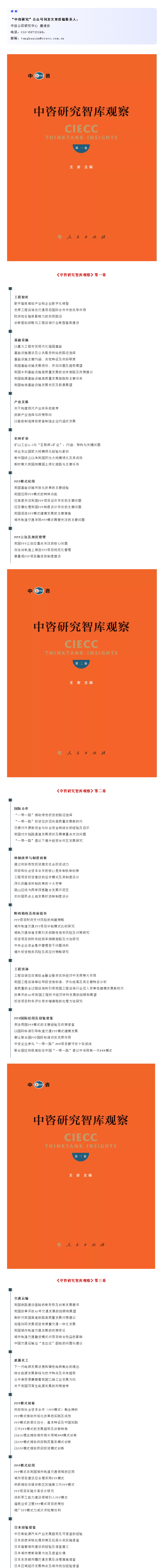 《左傳》云:太上有立德,其次有立功,其次有立言。雖久不廢,此之謂不朽。 《史記》曰:究天人之際,通古今之變,成一家之言。 《中咨研究智庫(kù)觀察》:2020年初,人民出版社出版發(fā)行! 作為中國(guó)規(guī)模最大的綜合性咨詢(xún)機(jī)構(gòu)和以工程咨詢(xún)?yōu)橹鳂I(yè)的公益類(lèi)中央企業(yè),中國(guó)國(guó)際工程咨詢(xún)有限公司(簡(jiǎn)稱(chēng)中咨公司)自誕生之日起,就肩負(fù)著“服務(wù)國(guó)家 貢獻(xiàn)社會(huì)”的使命。近40年來(lái),黨和國(guó)家領(lǐng)導(dǎo)人歷來(lái)十分關(guān)懷中咨公司的發(fā)展和貢獻(xiàn)。宋平同志為中咨公司確立了“公正、科學(xué)、可靠”的服務(wù)宗旨,明確提出“中咨公司不同于一般的公司,它不是以盈利為目的的經(jīng)營(yíng)性公司,它的基本宗旨是代表國(guó)家利益,對(duì)國(guó)家負(fù)責(zé)”。朱镕基同志以“敢言、多謀、慎斷”六字箴言為中咨公司確定了行為準(zhǔn)則,殷切希望“把中咨公司建設(shè)成為誠(chéng)信為本,優(yōu)質(zhì)高效,在國(guó)內(nèi)有權(quán)威,在國(guó)際上有影響的工程咨詢(xún)機(jī)構(gòu)”。 進(jìn)入新時(shí)代,黨中央、國(guó)務(wù)院更加重視中咨公司在國(guó)家經(jīng)濟(jì)建設(shè)和國(guó)防建設(shè)中的智庫(kù)參謀作用。習(xí)近平、李克強(qiáng)等中央領(lǐng)導(dǎo)同志多次在中咨公司有關(guān)報(bào)告上作出重要批示,充分肯定中咨公司在咨詢(xún)?cè)u(píng)估及智庫(kù)研究工作中的一系列重要建議。 高端智庫(kù)是國(guó)家軟實(shí)力的重要載體,承擔(dān)著推進(jìn)國(guó)家治理體系和治理能力現(xiàn)代化的歷史重任。2015年1月,國(guó)務(wù)院出臺(tái)《關(guān)于加強(qiáng)中國(guó)特色新型智庫(kù)建設(shè)的意見(jiàn)》,明確了新時(shí)期智庫(kù)建設(shè)的總體目標(biāo)和發(fā)展布局。中咨公司始終堅(jiān)持“不忘初心、牢記使命”,不斷開(kāi)拓創(chuàng)新、銳意進(jìn)取、把握規(guī)律,按照“12445”戰(zhàn)略構(gòu)想,努力將公司建設(shè)成為國(guó)內(nèi)有權(quán)威、國(guó)際有影響的中國(guó)特色新型高端智庫(kù),為更好地服務(wù)于國(guó)家經(jīng)濟(jì)建設(shè)和社會(huì)發(fā)展而努力奮斗。 中咨公司向來(lái)注重知識(shí)資產(chǎn)的創(chuàng)造和積累,也非常重視智庫(kù)成果的傳播工作。除向中央報(bào)送咨詢(xún)專(zhuān)報(bào)外,中咨公司鼓勵(lì)智庫(kù)專(zhuān)家接受專(zhuān)業(yè)媒體采訪,在重要論壇發(fā)表演講,發(fā)揮智庫(kù)成果的社會(huì)影響力。為探索中咨公司智庫(kù)成果傳播新渠道,加強(qiáng)高端智庫(kù)網(wǎng)絡(luò)建設(shè)和知識(shí)管理,2018年1月中咨公司開(kāi)通了“中咨研究”微信公眾號(hào),由研究中心負(fù)責(zé)運(yùn)營(yíng)維護(hù)。通過(guò)新媒體平臺(tái)發(fā)表中咨公司本部及所屬企業(yè)職工,以及公司離退休老專(zhuān)家的專(zhuān)業(yè)文章,旨在傳播中咨公司咨詢(xún)研究最新成果,促進(jìn)行業(yè)信息交流,提升中咨公司智庫(kù)建設(shè)及專(zhuān)業(yè)研究的社會(huì)影響力。 為更好地發(fā)揮中咨研究智庫(kù)成果的社會(huì)價(jià)值,研究中心對(duì)在“中咨研究”微信公眾號(hào)公開(kāi)發(fā)表的專(zhuān)業(yè)研究文章,精選編輯《中咨研究智庫(kù)觀察》叢書(shū),作為“中咨研究系列叢書(shū)”的一個(gè)系列,由人民出版社公開(kāi)出版發(fā)行。 人民出版社是中共中央宣傳部直屬的出版黨和國(guó)家重要文件的中央級(jí)權(quán)威出版機(jī)構(gòu),是中宣部直屬事業(yè)單位?!吨凶裳芯恐菐?kù)觀察》系列叢書(shū)由人民出版社公開(kāi)出版發(fā)行,將進(jìn)一步推動(dòng)中咨公司智庫(kù)成果的社會(huì)傳播。 《中咨研究智庫(kù)觀察》第一批圖書(shū)(1-3卷)于2020年初由人民出版社正式出版發(fā)行,收錄了2018年1月至2019年10月在“中咨研究”公眾號(hào)刊發(fā)的85篇精選文章,內(nèi)容涵蓋工程咨詢(xún)、工程智庫(kù)、基礎(chǔ)設(shè)施、產(chǎn)業(yè)發(fā)展、農(nóng)林礦業(yè)、能源化工、PPP模式,投融資體制改革、財(cái)政稅收與政府債務(wù)、國(guó)際合作、日本經(jīng)驗(yàn)借鑒等領(lǐng)域。 藏諸名山,傳之其人。中咨公司擬將《中咨研究智庫(kù)觀察》品牌工程持續(xù)推進(jìn)下去,研究中心目前正積極開(kāi)展《中咨研究智庫(kù)觀察》第二批圖書(shū)的文章征集刊發(fā)等相關(guān)工作,希望社會(huì)各界更加關(guān)注“中咨研究”微信公眾號(hào),同時(shí)希望中咨公司本部及所屬企業(yè)員工及離退休老專(zhuān)家,繼續(xù)為“中咨研究”微信公眾號(hào)積極撰寫(xiě)高質(zhì)量文稿,以便納入《中咨研究智庫(kù)觀察》叢書(shū)公開(kāi)出版發(fā)行,為中咨公司高端智庫(kù)建設(shè)不斷添磚加瓦。