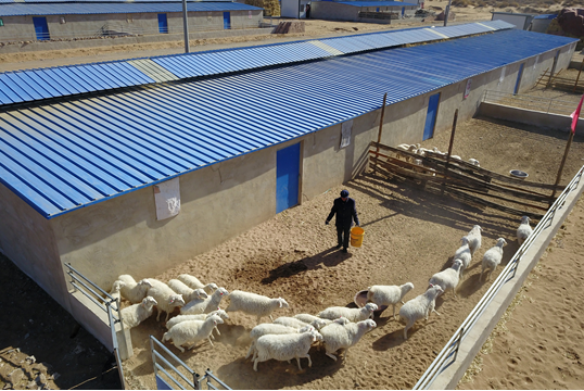 ▲ 在甘肅省武威市古浪縣黃花灘生態(tài)移民區(qū)富民新村,村民李應(yīng)川在喂羊(無(wú)人機(jī)照片,3月10日攝)。