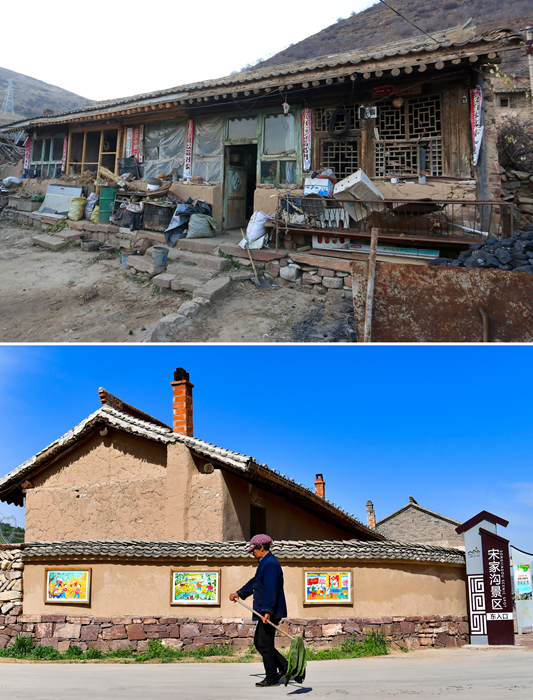 ▲上圖為山西省忻州市岢嵐縣宋家溝村村民在整村搬遷前居住的房屋(資料照片);下圖為山西省忻州市岢嵐縣宋家溝村的房屋。