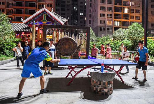 ▲ 居民在廣西大化瑤族自治縣古江安置區(qū)內(nèi)打乒乓球(5月15日攝)。