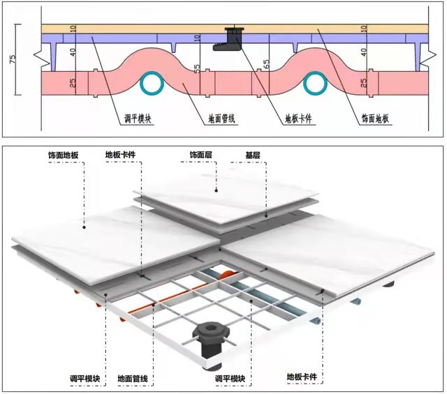 由調(diào)節(jié)支腳和架空格柵組成的調(diào)平模塊空腔中不僅可以敷設(shè)管線,而且縮短了架空高度,節(jié)省了室內(nèi)空間,實(shí)現(xiàn)管線分離;飾面地板模塊單獨(dú)可拆卸,實(shí)現(xiàn)設(shè)備和管線的可視化,便于后期設(shè)備和管線的檢修及更換,參見(jiàn)下圖。若選用地暖采暖,干法樓面可以組合采暖模塊,在架空格柵上直接安裝地暖模塊,并可直接敷設(shè)飾面地板,導(dǎo)熱快速。
