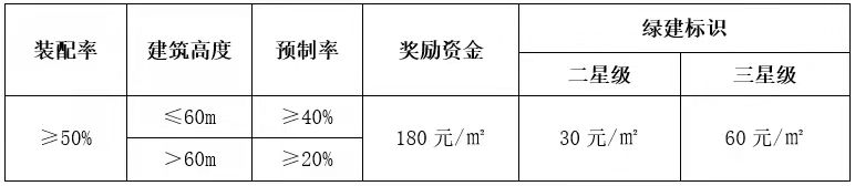 注:?jiǎn)雾?xiàng)目獎(jiǎng)勵(lì)金額最高不超2500萬(wàn)元。已享受獎(jiǎng)勵(lì)的裝配式項(xiàng)目,另外取得綠建二星級(jí)、三星級(jí)標(biāo)識(shí)的,增加獎(jiǎng)勵(lì)金額。達(dá)到相對(duì)應(yīng)的綠建星級(jí)后,單項(xiàng)目再獎(jiǎng)勵(lì)金額最高不超500萬(wàn)元。