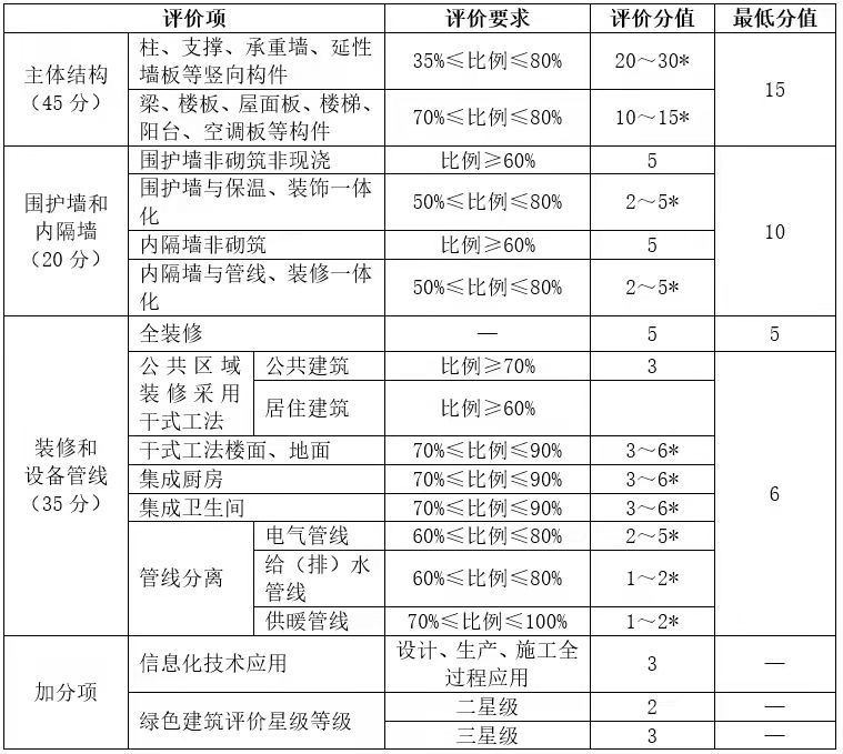 為在建筑領(lǐng)域貫徹落實(shí)創(chuàng)新、協(xié)調(diào)、綠色、開(kāi)放、共享的發(fā)展理念,加快推進(jìn)建筑業(yè)生產(chǎn)方式轉(zhuǎn)變,促進(jìn)北京市裝配式建筑發(fā)展,規(guī)范裝配式建筑評(píng)價(jià),自2021年7月1日北京市開(kāi)始全面執(zhí)行《裝配式建筑評(píng)價(jià)標(biāo)準(zhǔn)》(DB11/T 1831-2021)。該標(biāo)準(zhǔn)適用于北京市行政區(qū)域內(nèi)民用建筑的裝配化程度評(píng)價(jià)。建筑項(xiàng)目在考慮裝配式建筑技術(shù)應(yīng)用時(shí),可根據(jù)標(biāo)準(zhǔn)中四大類、十四個(gè)評(píng)價(jià)項(xiàng)的評(píng)價(jià)要求和評(píng)價(jià)分值進(jìn)行選擇。詳見(jiàn)下表: