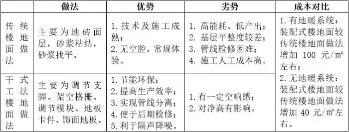 傳統(tǒng)樓面做法為濕法鋪攤砂漿施工方法,包括找平層、結(jié)合層、水泥砂漿粘貼面磚等多道工序,必要的管線將敷設(shè)其中。干式工法樓面做法采用架空自調(diào)平地面支撐系統(tǒng),配合復(fù)合地面裝飾材料,如地板、干法地磚等。干式工法樓面設(shè)置地面檢修口,內(nèi)部的架空層可用于安裝各類管線,達(dá)到管線與主體樓地面結(jié)構(gòu)分離。
