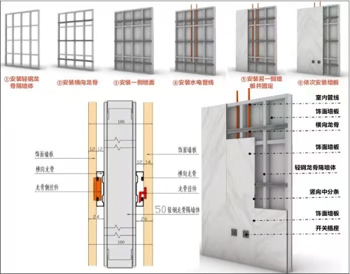 實(shí)施方法以輕鋼龍骨內(nèi)墻隔板為例,整個(gè)內(nèi)隔墻體系由輕鋼龍骨隔墻體,橫向龍骨,飾面材料組成,敷設(shè)管線時(shí),可在輕鋼龍骨隔墻體空腔中安排布置,不受傳統(tǒng)點(diǎn)位布置的局限。