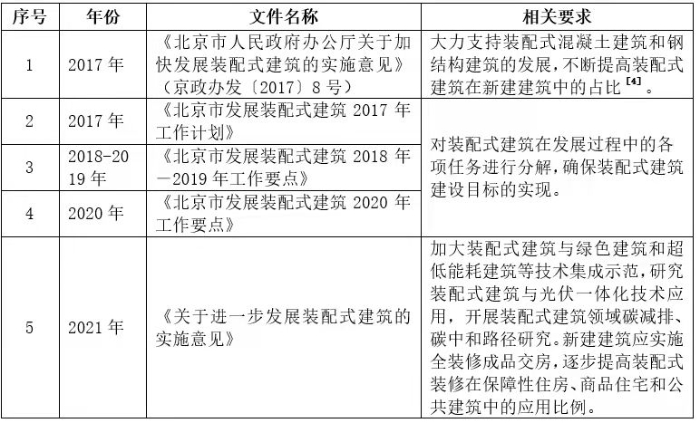 2021年上半年,全國(guó)各地裝配式建筑發(fā)展目標(biāo)及扶持政策匯總共有100余條。以北京市為例,自2017年以來(lái),逐年發(fā)布各類發(fā)展裝配式建筑的相關(guān)政策文件,大力支持發(fā)展并不斷提高裝配式建筑在新建建筑中的占比。相關(guān)政策文件如下[3]: