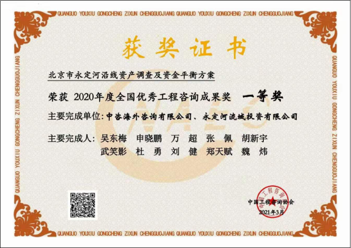 近日,在中國工程咨詢協會公布的“2020年度全國優(yōu)秀工程咨詢成果獎獲獎項目名單”中,中咨海外公司“雄安新區(qū)投融資專題研究報告”和“北京市永定河沿線資產調查及資金平衡方案”兩個咨詢成果分別榮獲全國優(yōu)秀工程咨詢成果一等獎!這是公司智庫建設成果的重大突破,是公司服務國家、履行職責擔當的重要體現!