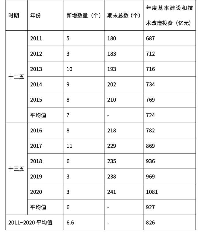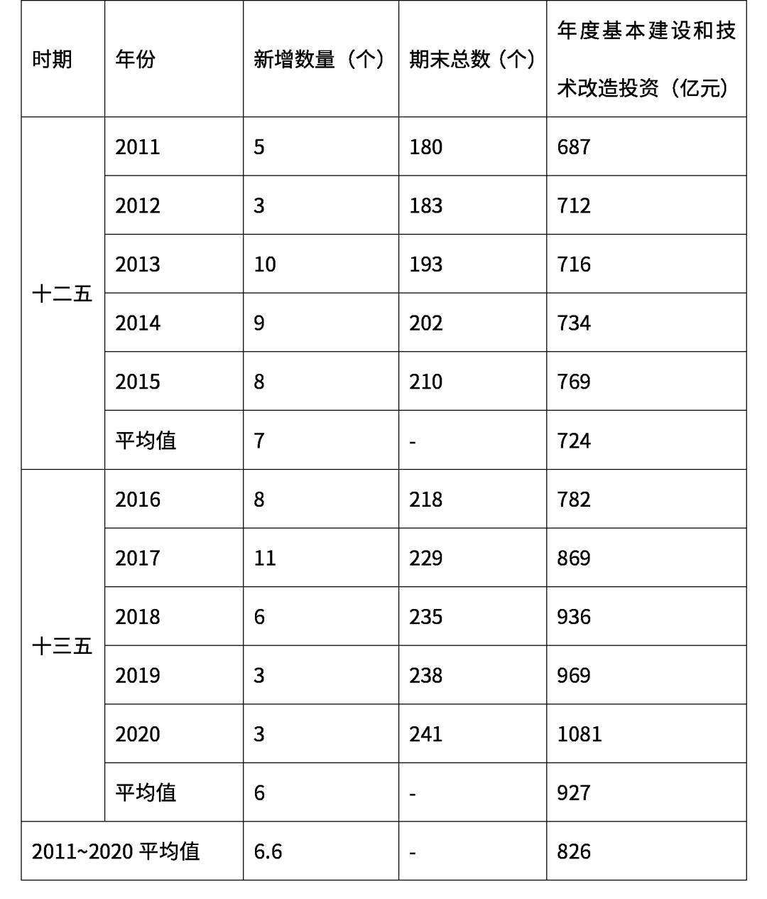 2011~2020年運(yùn)輸機(jī)場(chǎng)數(shù)量及建設(shè)投資統(tǒng)計(jì)表