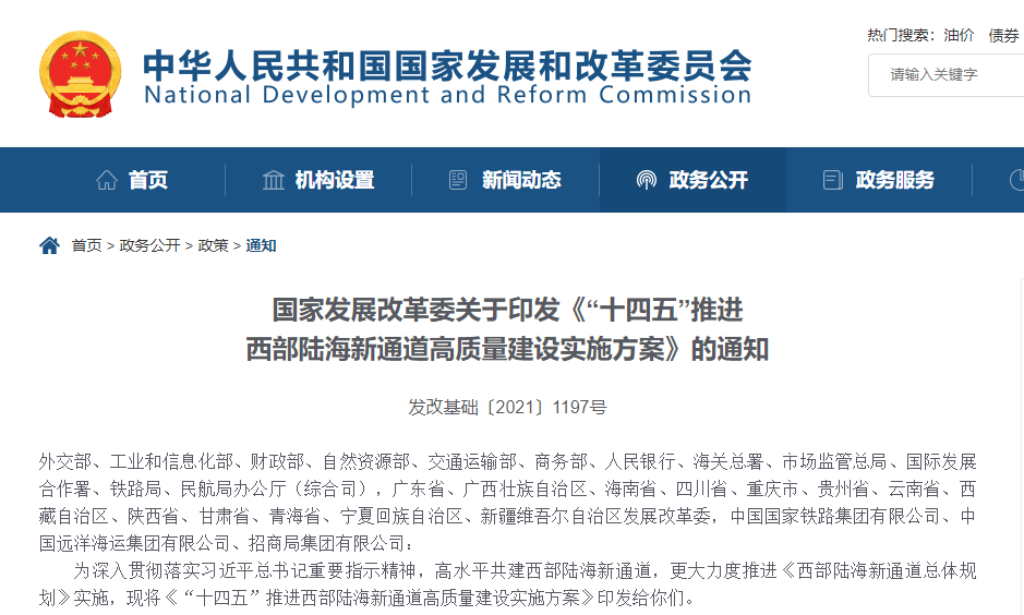 西部陸海新通道位于我國西部地區(qū)腹地,在區(qū)域協(xié)調(diào)發(fā)展格局中具有重要戰(zhàn)略地位?!笆奈濉币?guī)劃《綱要》明確提出實施西部陸海新通道等重大工程。近日,國家發(fā)展改革委印發(fā)《“十四五”推進西部陸海新通道高質(zhì)量建設(shè)實施方案》(以下簡稱《實施方案》),堅持問題導(dǎo)向和目標導(dǎo)向,從加快推進主通道建設(shè)、強化重要樞紐功能、提高通道運輸組織與物流效率、推動通道降低成本和優(yōu)化服務(wù)、構(gòu)建通道融合開放發(fā)展新局面等方面做出具體部署,具有很強的指導(dǎo)性和針對性,是“十四五”期間高質(zhì)量推進西部陸海新通道建設(shè)的綱領(lǐng)性文件。