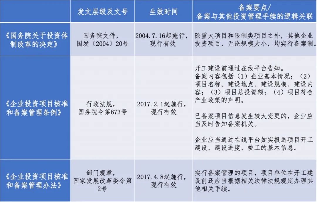 2017年2月1日國務(wù)院施行《企業(yè)投資項目核準(zhǔn)和備案管理條例》,將核準(zhǔn)和備案上升至國務(wù)院條例的高度,由此前對備案條件的事前審查變?yōu)槭轮惺潞蟊O(jiān)管,是備案制的一次重要變革。對于施行備案管理的項目范圍作了更明晰的規(guī)定:除了對關(guān)系國家安全、涉及全國重大生產(chǎn)力布局、戰(zhàn)略性資源開發(fā)和重大公共利益等項目實行核準(zhǔn)管理之外,其他項目一律實行備案管理。除國務(wù)院另有規(guī)定的,實行備案管理的項目按照屬地原則備案。實行備案管理的項目單位應(yīng)當(dāng)在開工建設(shè)前將企業(yè)基本情況、項目名稱、建設(shè)地點、建設(shè)規(guī)模、建設(shè)內(nèi)容、項目總投資額,以及項目符合產(chǎn)業(yè)政策的聲明等事項告知備案機關(guān)。后者收到以上全部信息即為備案。企業(yè)通過在線平臺如實報送項目開工建設(shè)、建設(shè)進(jìn)度、竣工的基本信息。備案機關(guān)采取在線監(jiān)測、現(xiàn)場核查等方式,加強對項目實施的監(jiān)督檢查,落實事中事后監(jiān)管責(zé)任。