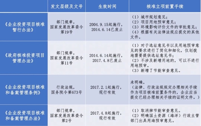 根據(jù)2016年發(fā)布的《企業(yè)投資項目核準(zhǔn)和備案管理條例》,國家發(fā)展和改革委員會于2017年發(fā)布了《企業(yè)投資項目核準(zhǔn)和備案管理辦法》,于2017年4月8日正式施行,《政府核準(zhǔn)投資項目管理辦法》同時廢止。項目申請報告附送文件做了進(jìn)一步的明確和調(diào)整:對于用地預(yù)審意見,由于政府行政職能調(diào)整,明確需要提供國土資源(海洋)行政主管部門出具的用海預(yù)審意見。國土資源主管部門明確可以不進(jìn)行用地預(yù)審的情形除外。此外,取消了立項之前必須提供節(jié)能審查意見的規(guī)定。