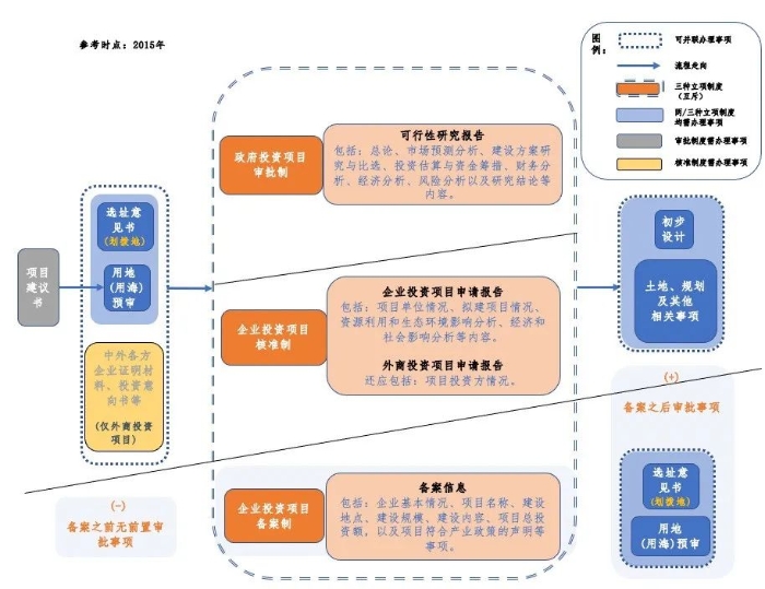 此后,在黨中央、國務(wù)院于2016年7月5日發(fā)布的《關(guān)于深化投融資體制改革的意見》中,進(jìn)一步針對審批制、核準(zhǔn)制、備案制項目分別提出不同的審批程序以及要點要求:對于采用直接投資和資本金注入方式的政府審批制項目,要嚴(yán)格審批項目建議書、可行性研究報告、初步設(shè)計;對于企業(yè)投資核準(zhǔn)制項目,遵循核準(zhǔn)范圍最小化的原則,最大限度精簡投資項目準(zhǔn)入階段的相關(guān)手續(xù);對于實行備案制的投資項目,政府部門依托投資項目在線審批監(jiān)管平臺或政務(wù)服務(wù)大廳實行并聯(lián)審查,不得設(shè)置任何前置條件。