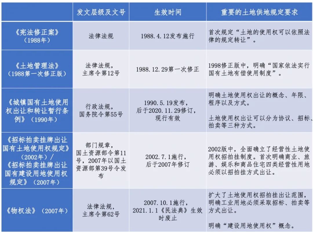 新中國(guó)成立以后,城鎮(zhèn)土地歸國(guó)家所有,無(wú)償?shù)亟o予全民所有制企業(yè)及事業(yè)單位使用,上世紀(jì)80年代,我國(guó)開(kāi)始探索土地使用權(quán)有償轉(zhuǎn)讓。一方面,從地方實(shí)踐來(lái)看,上世紀(jì)80年代深圳特區(qū)率先開(kāi)始試點(diǎn)征收土地使用費(fèi),80年代中后期試點(diǎn)范圍向全國(guó)擴(kuò)展,建立了福州市、??谑?、廣州市、廈門(mén)市、上海市、天津市等試點(diǎn)。另一方面,從中央頂層設(shè)計(jì)來(lái)看,我國(guó)的土地使用權(quán)有償轉(zhuǎn)讓制度隨著《憲法修正案》(1988年)、《土地管理法》、《城鎮(zhèn)國(guó)有土地使用權(quán)出讓和轉(zhuǎn)讓暫行條例》、《城市房地產(chǎn)管理法》等政策的頒布而逐步確立。