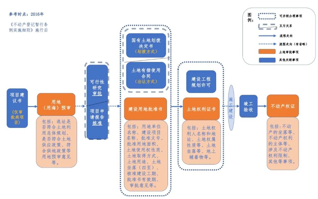 在過(guò)去二三十載,隨著政策法規(guī)的演進(jìn)和國(guó)家機(jī)構(gòu)的調(diào)整,土地有關(guān)手續(xù)發(fā)生了較大的變化,在2019年土地和規(guī)劃相關(guān)事項(xiàng)進(jìn)行整合之前,土地有關(guān)手續(xù)脈絡(luò)和要點(diǎn)如圖3所示(以2016年《不動(dòng)產(chǎn)登記暫行條例實(shí)施細(xì)則》施行后的審批或核準(zhǔn)類項(xiàng)目為例)。本流程圖以用地預(yù)審、建設(shè)用地批準(zhǔn)書(shū)、土地權(quán)利證書(shū)(不動(dòng)產(chǎn)權(quán)證)等土地手續(xù)為主線,主要為了闡明辦理土地方面項(xiàng)目前期工作手續(xù)的意義,以及與土地相關(guān)要件最緊要相關(guān)的其他工作手續(xù)事項(xiàng),其他項(xiàng)目前期工作手續(xù)有省略。