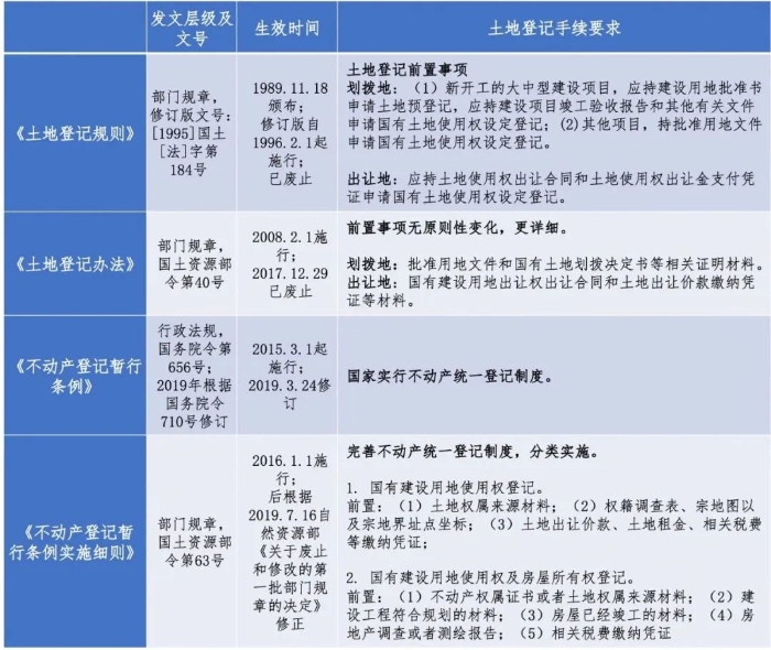 土地登記手續(xù)沿革情況如表4所示??梢钥吹剑覈?guó)土地登記手續(xù)大致可分為兩個(gè)階段,以2015年施行的《不動(dòng)產(chǎn)登記暫行條例》為分水嶺。第一階段以原國(guó)土資源部的《土地登記規(guī)則》和《土地登記辦法》為準(zhǔn)則,依據(jù)劃撥和出讓兩種土地取得方式,持批準(zhǔn)用地文件和國(guó)有土地劃撥決定書(shū)、國(guó)有土地使用權(quán)出讓合同和支付憑證等文件辦理土地登記。第二階段為2015年3月1日至今,建立并逐步完善了不動(dòng)產(chǎn)統(tǒng)一登記制度。對(duì)于依法取得國(guó)有建設(shè)用地使用權(quán),可以單獨(dú)申請(qǐng)國(guó)有建設(shè)用地使用權(quán)登記;對(duì)于依法利用國(guó)有建設(shè)用地建造房屋的,可以申請(qǐng)國(guó)有建設(shè)用地使用權(quán)及房屋所有權(quán)登記。國(guó)有建設(shè)用地使用權(quán)登記的前置手續(xù)不變;而國(guó)有建設(shè)用地使用權(quán)登記及房屋所有權(quán)登記的前置手續(xù)包括工程規(guī)劃許可竣工驗(yàn)收。
