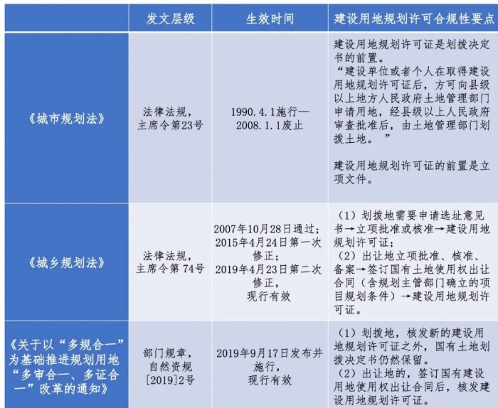 根據(jù)2008年開(kāi)始施行的《城鄉(xiāng)規(guī)劃法》:(1)在城市、鎮(zhèn)規(guī)劃區(qū)內(nèi)以劃撥方式提供國(guó)有土地使用權(quán)的建設(shè)項(xiàng)目,經(jīng)有關(guān)部門(mén)批準(zhǔn)、核準(zhǔn)、備案后,建設(shè)單位應(yīng)當(dāng)向城市、縣人民政府城鄉(xiāng)規(guī)劃主管部門(mén)提出建設(shè)用地規(guī)劃許可申請(qǐng),由城市、縣人民政府城鄉(xiāng)規(guī)劃主管部門(mén)依據(jù)控制性詳細(xì)規(guī)劃核定建設(shè)用地的位置、面積、允許建設(shè)的范圍,核發(fā)建設(shè)用地規(guī)劃許可證。建設(shè)單位在取得建設(shè)用地規(guī)劃許可證后,方可向縣級(jí)以上地方人民政府土地主管部門(mén)申請(qǐng)用地,經(jīng)縣級(jí)以上人民政府審批后,由土地主管部門(mén)劃撥土地。(2)以出讓方式取得國(guó)有土地使用權(quán)的建設(shè)項(xiàng)目,建設(shè)單位在取得建設(shè)項(xiàng)目的批準(zhǔn)、核準(zhǔn)、備案文件和簽訂國(guó)有土地使用權(quán)出讓合同后,向城市、縣人民政府城鄉(xiāng)規(guī)劃主管部門(mén)領(lǐng)取建設(shè)用地規(guī)劃許可證。城市、縣人民政府城鄉(xiāng)規(guī)劃主管部門(mén)不得在建設(shè)用地規(guī)劃許可證中,擅自改變作為國(guó)有土地使用權(quán)出讓合同組成部分的規(guī)劃條件。此項(xiàng)內(nèi)容在后續(xù)訂正過(guò)程中(最近一次修訂為2019年4月23日版本)未發(fā)生變化,至今生效。