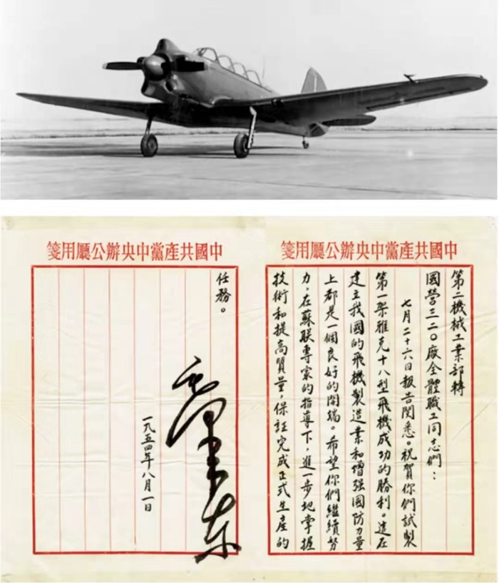 新中國第一架自制飛機【初教五】。1954年7月3日,新中國第一架自己制造的飛機——初教5(雅克-18)飛機,在南昌騰空而起,標志著中國由修理飛機到仿制飛機的突破。8月1日,毛主席親自簽署嘉勉信。