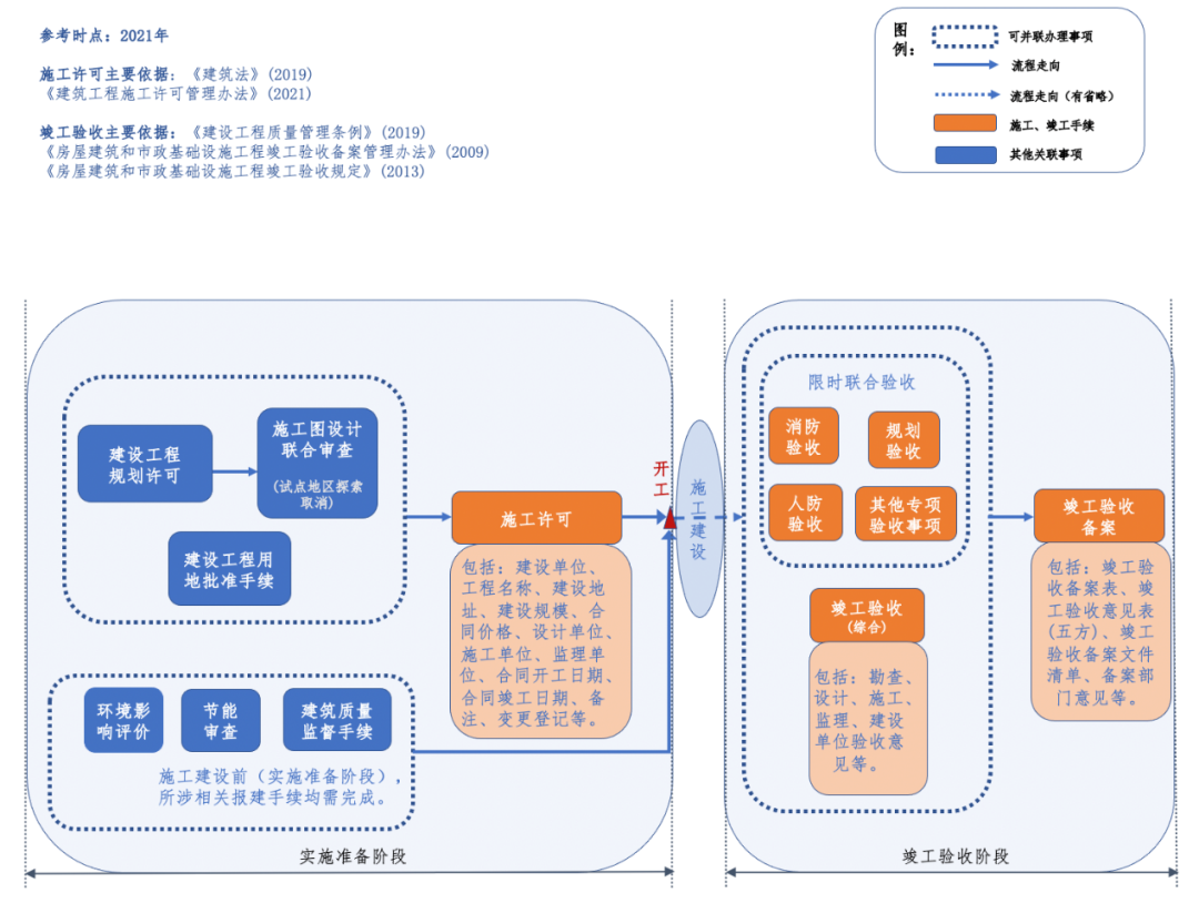 編者按 新中國成立以來,我國基礎(chǔ)設(shè)施投資建設(shè)取得了舉世矚目的成就,是國家經(jīng)濟(jì)社會發(fā)展的重要支撐,為人民生活水平的提高做出了巨大貢獻(xiàn)。改革開放以來,市場開始發(fā)揮配置資源的決定性作用,為我國基礎(chǔ)設(shè)施的發(fā)展煥發(fā)了新的活力。據(jù)統(tǒng)計(jì),我國基礎(chǔ)設(shè)施資產(chǎn)總規(guī)模在1990年排在全世界約第15位,2000年上升到第7位,2010年躍升為第3位,至2018年已居世界首位。 黨的二十大報(bào)告在回顧過去五年的工作和新時代十年的偉大變革中,充分肯定了基礎(chǔ)設(shè)施在經(jīng)濟(jì)社會中發(fā)揮的重要作用。報(bào)告指出,我國“建成世界最大的高速鐵路網(wǎng)、高速公路網(wǎng),機(jī)場港口、水利、能源、信息等基礎(chǔ)設(shè)施建設(shè)取得重大成就”。我國基礎(chǔ)設(shè)施多年來大規(guī)模的投資建設(shè)和存量資產(chǎn)的高速積累,是黨中央、國務(wù)院在建立社會主義市場經(jīng)濟(jì)體制背景下,關(guān)于投融資體制改革部署的重要成果。 項(xiàng)目前期工作手續(xù)的合規(guī)性要求,是基礎(chǔ)設(shè)施能夠發(fā)揮其應(yīng)有價值的重要前提,也是投融資體制改革關(guān)注的重點(diǎn)內(nèi)容之一。伴隨著政府職能轉(zhuǎn)變、深化“放管服”改革和擴(kuò)大有效投資等重大決策的關(guān)鍵部署,我國工程建設(shè)項(xiàng)目審批制度不斷優(yōu)化和改革,基礎(chǔ)設(shè)施項(xiàng)目投資前期決策管理經(jīng)歷了復(fù)雜的演變進(jìn)程,其合規(guī)性標(biāo)準(zhǔn)也在與時俱進(jìn)、不斷完善。當(dāng)前我國已進(jìn)入基礎(chǔ)設(shè)施存量時代,存量資產(chǎn)項(xiàng)目前期工作手續(xù)的合規(guī)性是重要的盤活條件之一,部分合規(guī)性問題已成為新時代社會廣泛關(guān)注的焦點(diǎn)。本項(xiàng)專題研究立足投融資體制和項(xiàng)目審批制度變革的歷史背景,嘗試?yán)迩寤A(chǔ)設(shè)施項(xiàng)目在立項(xiàng)、土地、規(guī)劃、環(huán)境、建設(shè)施工等方面主要前期工作的歷史變革脈絡(luò),梳理不同管理事項(xiàng)之間的邏輯關(guān)聯(lián),從這一視角提供基礎(chǔ)設(shè)施項(xiàng)目前期工作手續(xù)的合規(guī)性認(rèn)識。本公眾號將研究報(bào)告的部分成果以系列文章的形式陸續(xù)刊發(fā),研究報(bào)告第一部分為背景與立項(xiàng)篇,第二部分為土地與規(guī)劃篇,本文是系列研究報(bào)告的第三部分(建設(shè)施工篇),供業(yè)界同仁參考。 基礎(chǔ)設(shè)施項(xiàng)目前期工作手續(xù)合規(guī)性研究(Ⅲ) 張雪飛 伍迪 摘要:開工和竣工是基礎(chǔ)設(shè)施項(xiàng)目建設(shè)施工方面的重要工作節(jié)點(diǎn),依法合規(guī)開展有關(guān)工作是項(xiàng)目的合規(guī)性前提。建筑工程施工許可證(或開工報(bào)告)是建筑施工單位符合施工條件、允許開工的批準(zhǔn)文件,是建設(shè)單位進(jìn)行工程施工的法律憑證,是工程項(xiàng)目由實(shí)施準(zhǔn)備轉(zhuǎn)向施工建設(shè)、由藍(lán)圖設(shè)計(jì)變成項(xiàng)目實(shí)體的重要工作手續(xù)??⒐を?yàn)收是建設(shè)工程項(xiàng)目竣工后,全面考核建設(shè)工作、檢查是否符合設(shè)計(jì)要求和工程質(zhì)量的重要環(huán)節(jié),是工程項(xiàng)目由施工建設(shè)走向運(yùn)營投產(chǎn),是建設(shè)投資成果轉(zhuǎn)入交付使用的關(guān)鍵工作事項(xiàng)。本文聚焦基礎(chǔ)設(shè)施項(xiàng)目建設(shè)施工方面的手續(xù),尤其對施工許可和竣工驗(yàn)收兩方面的主要內(nèi)容和制度演進(jìn)進(jìn)行系統(tǒng)梳理,供業(yè)界參考。 關(guān)鍵詞:基礎(chǔ)設(shè)施;合規(guī)性;施工許可;竣工驗(yàn)收;政策演進(jìn) 一、施工許可手續(xù)合規(guī)性 (一)內(nèi)涵與適用范圍 建筑工程施工許可證是建筑施工單位符合施工條件、允許開工的批準(zhǔn)文件,是建設(shè)單位進(jìn)行工程施工的法律憑證。根據(jù)有關(guān)法律政策規(guī)定,在中華人民共和國境內(nèi)從事各類房屋建筑及其附屬設(shè)施的建造、裝修裝飾和與其配套的線路、管道、設(shè)備的安裝,以及城鎮(zhèn)市政基礎(chǔ)設(shè)施工程的施工,建設(shè)單位在開工前應(yīng)當(dāng)向工程所在地縣級以上人民政府建設(shè)行政主管部門申請領(lǐng)取施工許可證,國務(wù)院建設(shè)行政主管部門確定的限額以下的小型工程除外。具體而言,對于工程投資額在30萬元以下或者建筑面積在300平方米以下的建筑工程,可以不申請辦理施工許可證。各省、自治區(qū)、直轄市人民政府住房城鄉(xiāng)建設(shè)主管部門可以根據(jù)當(dāng)?shù)氐膶?shí)際情況,對限額進(jìn)行調(diào)整,并報(bào)國務(wù)院住房城鄉(xiāng)建設(shè)主管部門備案。按照國務(wù)院規(guī)定的權(quán)限和程序批準(zhǔn)開工報(bào)告的建筑工程,不再領(lǐng)取施工許可證。 辦理施工許可證有關(guān)事項(xiàng)應(yīng)主要以《中華人民共和國建筑法》(以下簡稱《建筑法》)和《建筑工程施工許可管理辦法》等法規(guī)政策為依據(jù)。根據(jù)最新修訂且現(xiàn)行有效的2019年版《建筑法》和2021年版《建筑工程施工許可管理辦法》,申請領(lǐng)取施工許可證,應(yīng)當(dāng)符合的條件