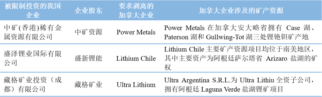 我國企業(yè)參與國際礦產(chǎn)資源競爭受政治因素影響較大,原材料資源控制力較弱。現(xiàn)階段,各國企業(yè)主要通過收購礦業(yè)公司控股權(quán)參與礦產(chǎn)資源競爭,但西方國家將礦產(chǎn)資源作為國家安全的重要組成部分,出臺(tái)國家層面保障供應(yīng)鏈安全的政策干預(yù)市場,導(dǎo)致我國企業(yè)對(duì)礦場資源的控制力和話語權(quán)較弱。2022年6月,加拿大與美國簽訂關(guān)鍵礦產(chǎn)合作聯(lián)合行動(dòng)計(jì)劃,保障戰(zhàn)略制造業(yè)所需關(guān)鍵礦物的供應(yīng);2022年11月,加拿大創(chuàng)新、科技和經(jīng)濟(jì)發(fā)展部以威脅國家安全為由,下令我國三家企業(yè)剝離對(duì)加拿大關(guān)鍵礦物公司的投資,通過行政命令直接限制我國對(duì)該國鋰礦資產(chǎn)的投資。其中,要求剝離的企業(yè)所持有的礦產(chǎn)資源并非均為加拿大本土資源,還涉及南美、阿根廷等地區(qū)的鋰礦資源,具體如表6所示。