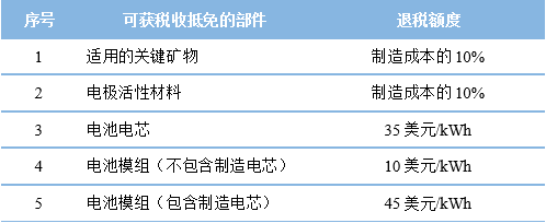 表4 美國《通脹削減法案》對(duì)電池部件制造退稅額度