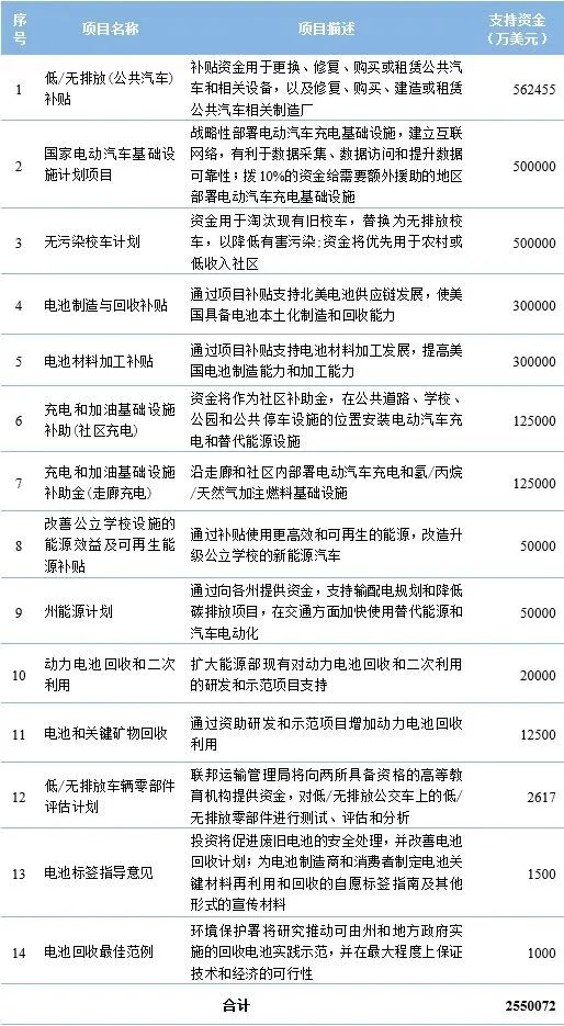 拜登于2021年11月簽署通過《兩黨基礎(chǔ)設(shè)施法》,為更新美國陳舊老化的基礎(chǔ)設(shè)施,擬在未來5年新增投資5500億美元,用于供水、寬帶、橋梁、機(jī)場、鐵路、充電樁、電力、公共交通、環(huán)境修復(fù)等設(shè)施建設(shè)。截至2022年11月,該法案已推出378個(gè)補(bǔ)貼項(xiàng)目,其中,與新能源汽車產(chǎn)業(yè)相關(guān)項(xiàng)目14個(gè),合計(jì)超過255億美元,涵蓋電池材料加工、動(dòng)力電池制造與回收、充電樁基礎(chǔ)設(shè)施建設(shè)、公共交通電動(dòng)化等,具體如表1所示。