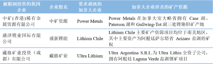 表6 加拿大限制我國對(duì)其鋰礦資產(chǎn)投資情況