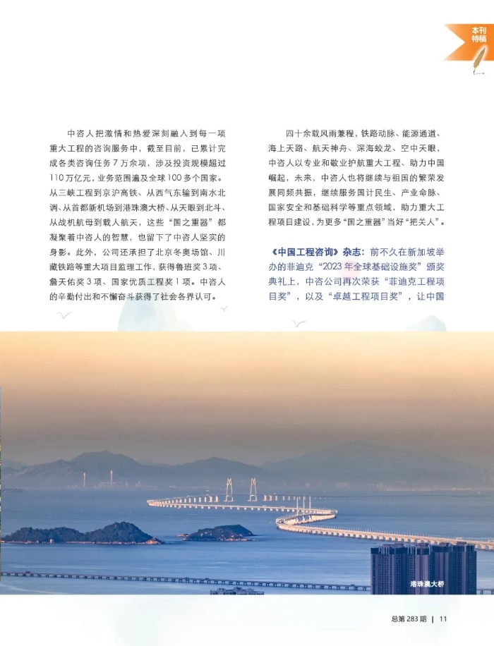 中咨人把激情和熱愛深刻融入到每一項重大工程的咨詢服務中,截至目前,已累計完成各類咨詢?nèi)蝿?萬余項,涉及投資規(guī)模超過110萬億元,業(yè)務范圍遍及全球100多個國家。從三峽工程到京滬高鐵、從西氣東輸?shù)侥纤闭{(diào)、從首都新機場到港珠澳大橋、從天眼到北斗、從戰(zhàn)機航母到載人航天,這些“國之重器”都凝聚著中咨人的智慧,也留下了中咨人堅實的身影。此外,公司還承擔了北京冬奧場館、川藏鐵路等重大項目監(jiān)理工作,獲得魯班獎3項、詹天佑獎3項、國家優(yōu)質(zhì)工程獎1項。中咨人的辛勤付出和不懈奮斗獲得了社會各界認可。