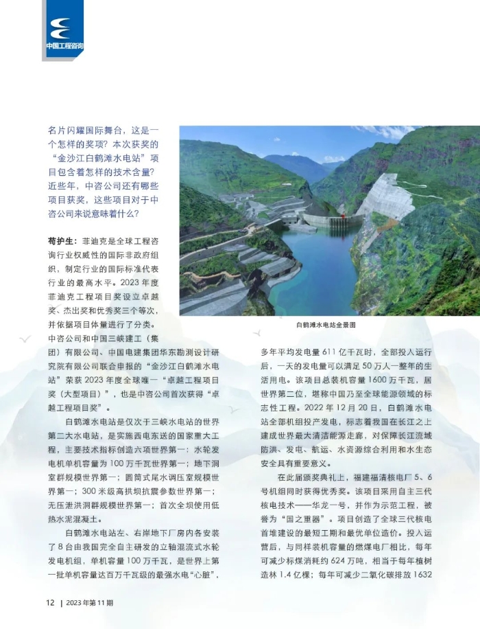 《中國工程咨詢》雜志:前不久在新加坡舉辦的菲迪克“2023年全球基礎(chǔ)設(shè)施獎”頒獎典禮上,中咨公司再次榮獲“菲迪克工程項目獎”,以及“卓越工程項目獎”,讓中國名片閃耀國際舞臺,這是一個怎樣的獎項?本次獲獎的“金沙江白鶴灘水電站”項目包含著怎樣的技術(shù)含量?近些年,中咨公司還有哪些項目獲獎,這些項目對于中咨公司來說意味著什么?