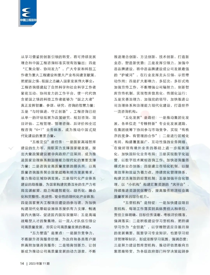 “五維定位”是任務:一是國家高端智庫建設(shè)的生力軍,用軟實力支撐國家硬發(fā)展,提出大量政策建議被中央政府廣泛采用,成為推進國家治理體系和治理能力現(xiàn)代化的重要支撐力量;二是咨詢業(yè)高質(zhì)量發(fā)展的排頭兵,以高質(zhì)量咨詢服務契合國家戰(zhàn)略和地方發(fā)展需求,著力推動區(qū)域協(xié)調(diào)發(fā)展。三是現(xiàn)代化產(chǎn)業(yè)體系建設(shè)的助推器,為國家構(gòu)建優(yōu)勢互補的生產(chǎn)力布局出謀獻策,助力構(gòu)建智能化、綠色化、融合化和完整性、先進性、安全性的現(xiàn)代化產(chǎn)業(yè)體系;四是國家重大工程項目建設(shè)的參與者,為加快構(gòu)建現(xiàn)代化基礎(chǔ)設(shè)施體系提供有力支撐,暢通國內(nèi)大循環(huán)、促進國內(nèi)國際雙循環(huán);五是高端戰(zhàn)略型人才的聚集地,以一流人才隊伍引領(lǐng)公司高質(zhì)量發(fā)展,夯實公司高質(zhì)量發(fā)展的基礎(chǔ)。