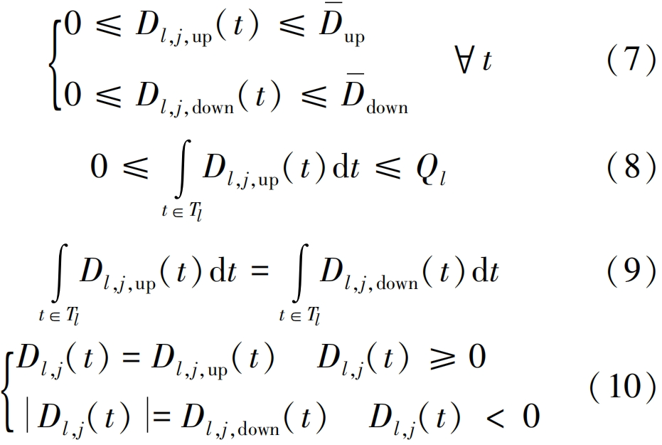 式中:image024.png分別為負(fù)荷上、下調(diào)整功率;image025.png分別為負(fù)荷上、下調(diào)整功率最大值,通??扇∽畲筘?fù)荷的5%;image026.png為調(diào)整周期內(nèi)負(fù)荷調(diào)整電量上限;image028.png為負(fù)荷調(diào)整周期,由于負(fù)荷具有日變化周期特性,因此image028.png可取1d。
