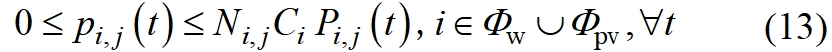 式中:image035.png為新能源出力隨機(jī)場景序列;image036.png為新能源機(jī)組臺數(shù);image037.png為新能源機(jī)組單機(jī)容量。水電出力功率取決于河流流量,出力約束為: