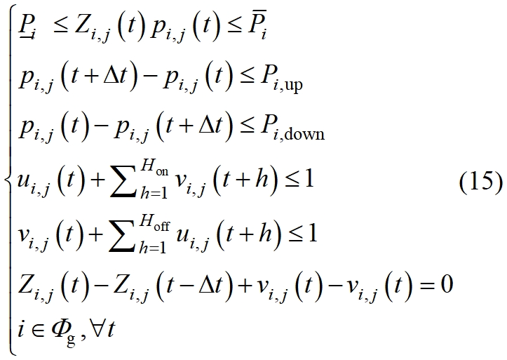 式中:image041.png分別為機(jī)組上、下爬坡率;image042.png為二進(jìn)制變量,分別表示機(jī)組啟、停機(jī)狀態(tài);image043.png表示爬坡時間間隔;image044.png為二進(jìn)制變量,表示機(jī)組運(yùn)行狀態(tài);image045.png