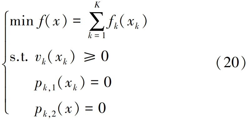 式中:image067.png為原問題目標(biāo)函數(shù);image068.png為子問題k的目標(biāo)函數(shù);image069.png為僅與子問題k內(nèi)部參數(shù)相關(guān)的不等式約束;image070.png為僅與子問題k內(nèi)部參數(shù)相關(guān)的等式約束;image071.png為各子問題與外界耦合的復(fù)雜約束。