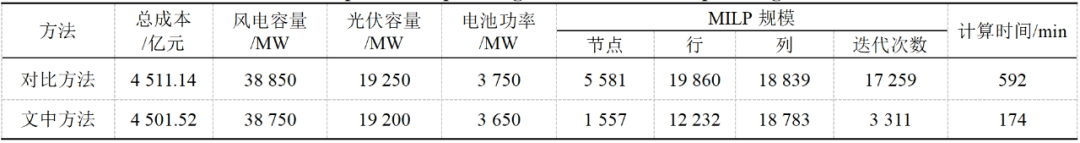 總的來說,針對前述算例測試系統(tǒng),文中所提基于區(qū)域分解協(xié)調(diào)的分層優(yōu)化方法可以在較短時間內(nèi)得到較為精確的風(fēng)光儲能規(guī)劃方案,在大規(guī)模復(fù)雜系統(tǒng)的優(yōu)化求解中具有明顯提升計(jì)算效率的優(yōu)勢。
