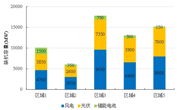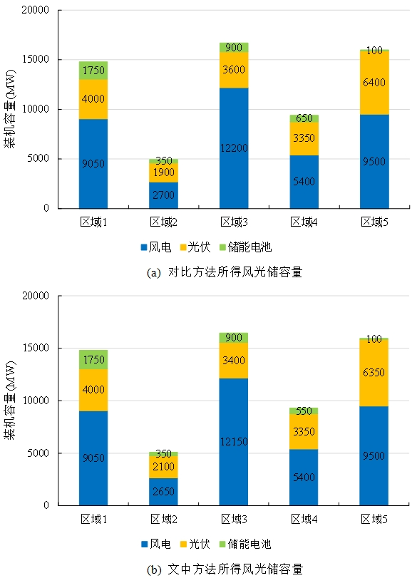 (3) 不同場景所得結(jié)果分析。為驗(yàn)證文中所提多區(qū)域風(fēng)光儲聯(lián)合規(guī)劃模型的合理性,設(shè)置對比場景進(jìn)行比較分析,對比場景中不考慮區(qū)域間聯(lián)絡(luò)線斷面約束。2個案例的規(guī)劃結(jié)果見表2,對比場景的各區(qū)域電源和儲能規(guī)劃容量如圖5所示,文中場景的各區(qū)域規(guī)劃結(jié)果如圖3(b)所示。