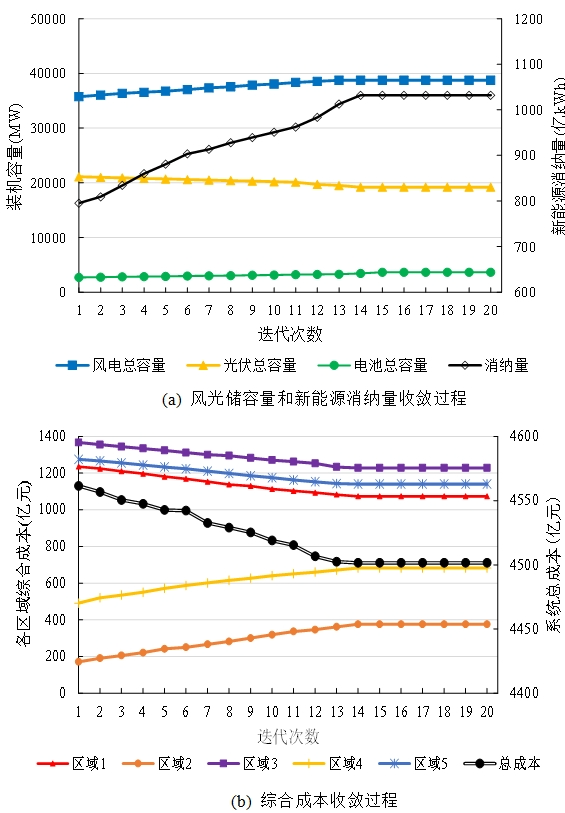 (2) 所提求解方法的收斂性分析。在求解優(yōu)化問題時,判斷一個求解方法能否得到最優(yōu)解的依據(jù)之一是其計(jì)算結(jié)果可收斂。為了驗(yàn)證文中所采用的基于區(qū)域分解協(xié)調(diào)的求解算法可以收斂到全局最優(yōu)解,對分解協(xié)調(diào)算法求解模型時的收斂過程進(jìn)行分析,圖4為迭代過程中規(guī)劃結(jié)果收斂曲線。