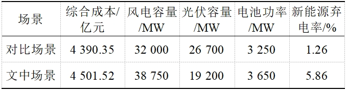 總之,基于文中所提模型,系統(tǒng)目標(biāo)函數(shù)能夠收斂,新能源裝機(jī)容量也能達(dá)到收斂標(biāo)準(zhǔn),因此,所提算法可以在一定的誤差要求和有限的迭代次數(shù)內(nèi)收斂到全局最優(yōu)解,滿足工程實(shí)際的需求。
