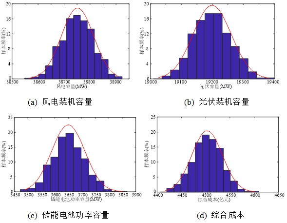 (4) 隨機(jī)因素對規(guī)劃結(jié)果的影響。新能源隨機(jī)出力對風(fēng)光儲聯(lián)合規(guī)劃結(jié)果具有重要影響,須在規(guī)劃模型中加以考慮。本節(jié)分別以60組隨機(jī)場景為輸入求解規(guī)劃模型,得到各組序列下的風(fēng)光儲最優(yōu)容量以及綜合成本,如圖6所示。圖中藍(lán)色柱狀圖表示60組隨機(jī)場景下所得結(jié)果的概率分布;紅色曲線表示概率分布的擬合結(jié)果,用來表示概率分布的形狀。可以看出,所有場景下風(fēng)電裝機(jī)容量、光伏裝機(jī)容量、儲能電池功率容量以及系統(tǒng)綜合成本的收斂結(jié)果分別為38750MW、19 200MW、3650MW以及4501.52億元,所有場景的計(jì)算結(jié)果均服從正態(tài)分布。文中所提模型可以應(yīng)對新能源隨機(jī)出力,適用于不同隨機(jī)場景下的源儲規(guī)劃分析。