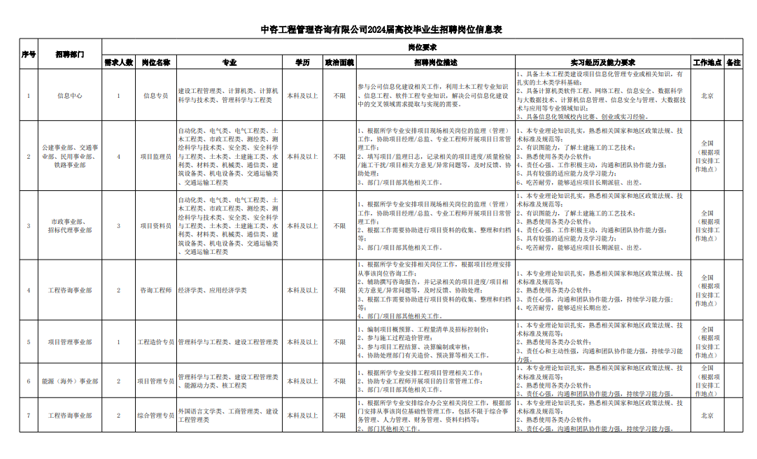 中咨工程管理咨詢有限公司招聘崗位信息