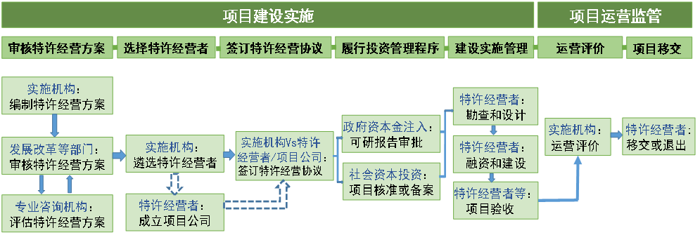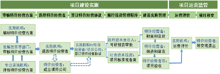 《PPP新機(jī)制》將特許經(jīng)營項目周期管理分為建設(shè)實施和運(yùn)營監(jiān)管兩大階段。其中,建設(shè)實施包括審核特許經(jīng)營方案、選擇特許經(jīng)營者、簽訂特許經(jīng)營協(xié)議、履行投資管理程序、開展建設(shè)實施管理等步驟,運(yùn)營監(jiān)管包括開展運(yùn)營評價、項目移交或退出等步驟。