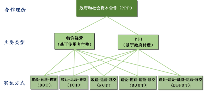 綜上所述,在PPP概念體系中,PPP作為公共部門與私人部門之間的合作理念,被國內(nèi)外普遍采用,更多地體現(xiàn)為“利益共享、風(fēng)險共擔(dān)”的伙伴關(guān)系。按照付費(fèi)機(jī)制,PPP模式分為特許經(jīng)營和PFI兩種主要類型,而BOT及其衍生形式屬于第三層級的具體實施方式。它們之間層級關(guān)系如圖3所示。