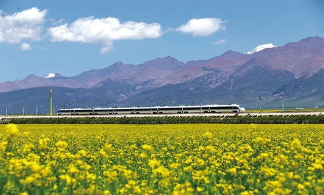 蘭新鐵路是中歐班列的主要運(yùn)輸通道之一,是服務(wù)“一帶一路”建設(shè)的重點(diǎn)鐵路工程。圖為2023年7月22日,蘭新高鐵一列動(dòng)車從中國青海省門源縣百里油菜花海駛過。 中新社發(fā) 成林/攝