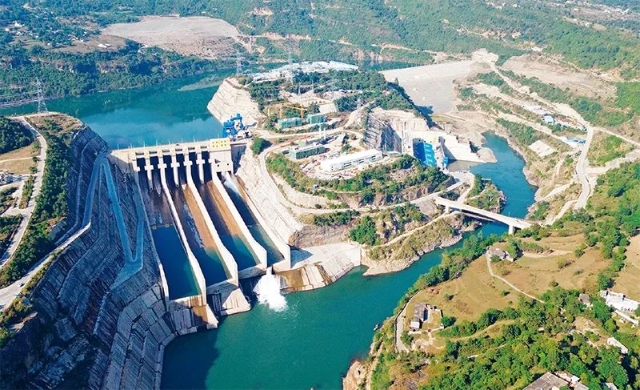 由中國三峽集團(tuán)為主投資方投資建設(shè)的卡洛特水電站是中巴經(jīng)濟(jì)走廊首個(gè)水電投資項(xiàng)目,位于巴基斯坦旁遮普省卡洛特地區(qū),水電站總裝機(jī)容量72萬千瓦,2022年6月全面投產(chǎn)發(fā)電。圖為2023年10月29日拍攝的卡洛特水電站。 中國三峽集團(tuán)供圖