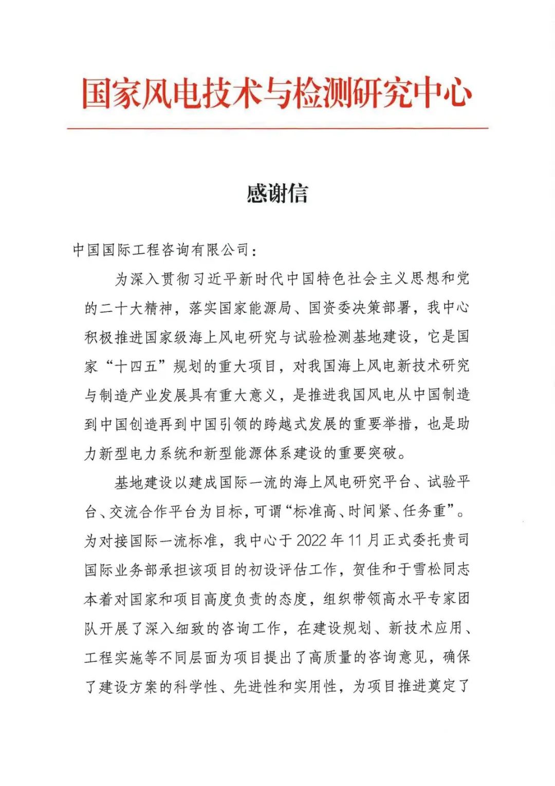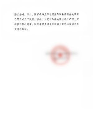 咨詢團隊出色的工作贏得了委托方的充分認可,海上風(fēng)電試驗基地一開工,項目單位國家風(fēng)電技術(shù)與檢測研究中心便發(fā)來感謝信,在分享喜悅的同時,對咨詢團隊表達衷心的感謝。