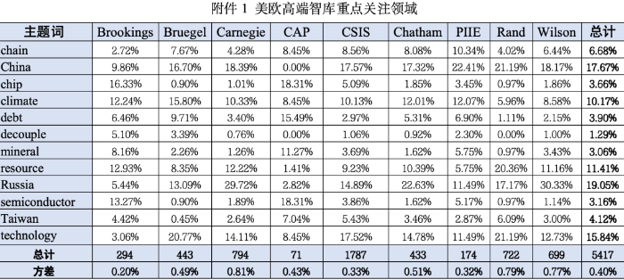 2023上半年,各歐美智庫(kù)與中國(guó)、俄羅斯等相關(guān)的主題報(bào)告占比在五分之二左右,與供應(yīng)鏈、芯片產(chǎn)業(yè)、半導(dǎo)體產(chǎn)業(yè)、礦產(chǎn)產(chǎn)業(yè)、脫鉤等相關(guān)的主題報(bào)告占比在五分之一左右,與氣候、資源、債務(wù)等相關(guān)的主題報(bào)告占比約五分之一,與臺(tái)灣、科技主題相關(guān)的報(bào)告約占五分之一。不同主題下智庫(kù)關(guān)注的重點(diǎn)領(lǐng)域分析參見附件1。